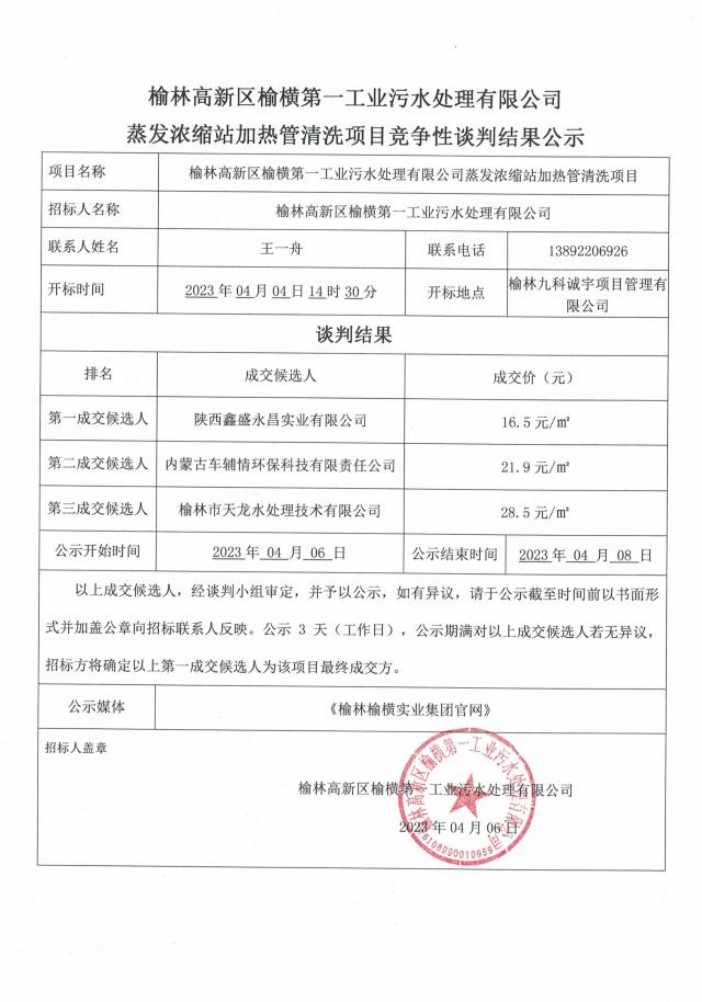 榆林高新区榆横第一工业污水处理有限公司 蒸发浓缩站加热管清洗项目竞争性谈判结果公示