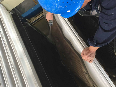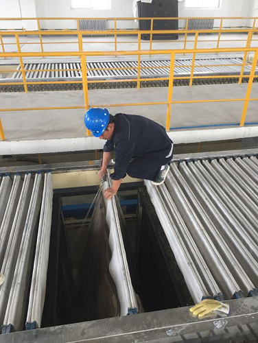 近期,由于水质变化较大,污泥量明显增加,导致污泥池液位持续升高,板框压滤机滤布结垢严重,经过多次水洗酸洗效果不佳,为尽快降低污泥池液位,缓解生产压力,提高板框压滤机的压泥效率,最终经研究由机修人员利用高压水枪逐块进行人工清洗,并对结垢严重的滤布送到化验室进行不同浓度酸浸泡实验,解决板框机滤布结垢问题。