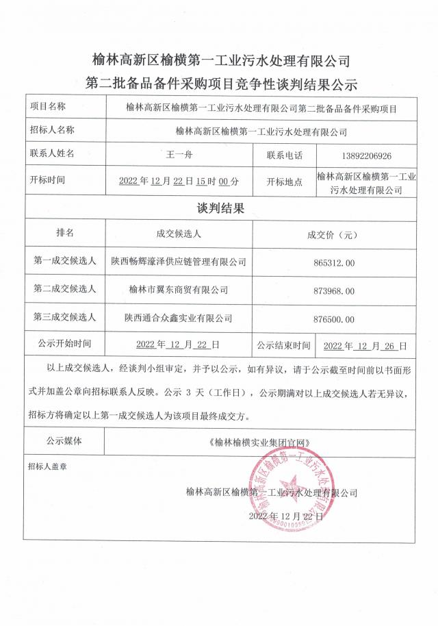 榆林高新区榆横第一工业污水处理有限公司-榆林高新区榆横第一工业污水处理有限公司第二批备品备件采购项目谈判结果公示