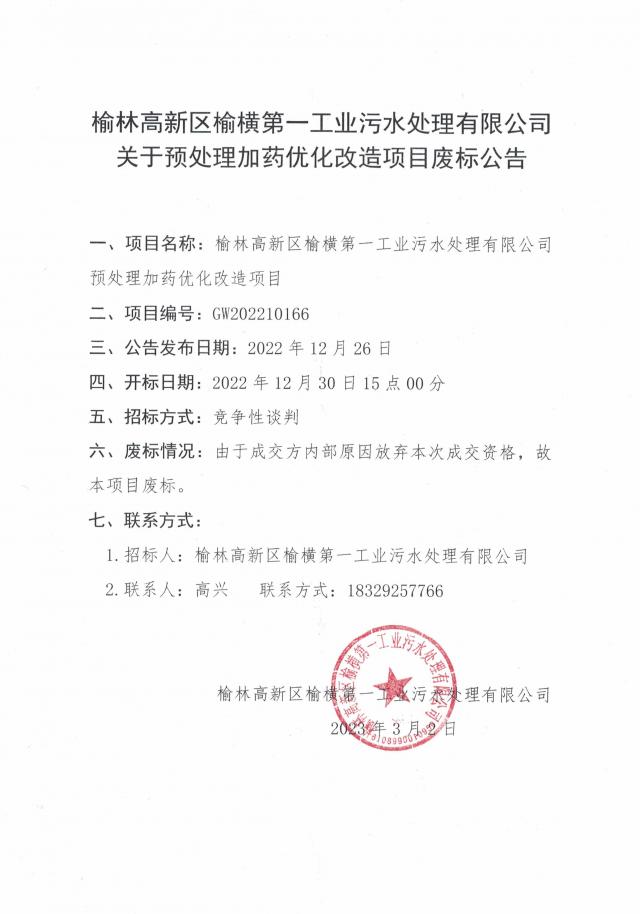 榆林高新区榆横第一工业污水处理有限公司关于预处理加药优化改造项目废标公告